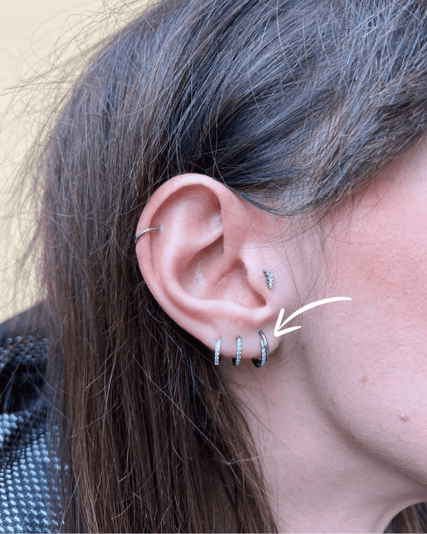 Gioiello in titanio ASTM F136 con doppia fascia intrecciata e zirconi CZ trasparenti. Anallergico, sterilizzabile e con chiusura a scatto. Ideale per lobo, helix, conch.